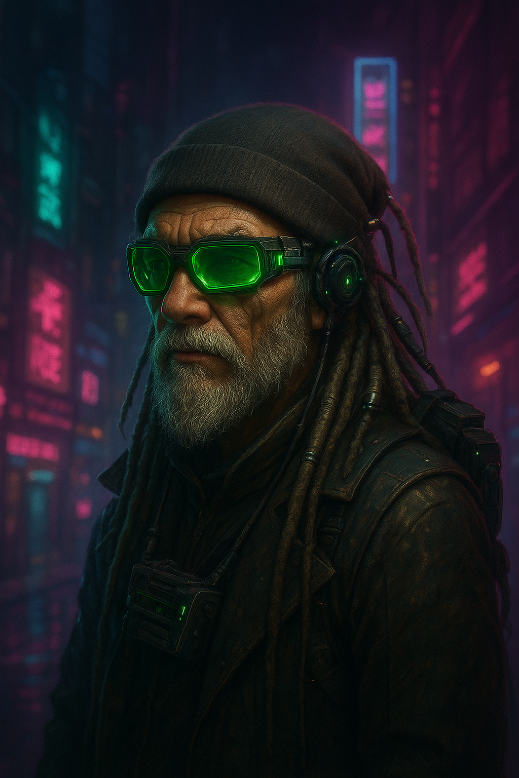 Óculos neon verde; barba grisalha com microdrones enfeitando as tranças; gaita digital plugada nas costas como se fosse um rifle laser.